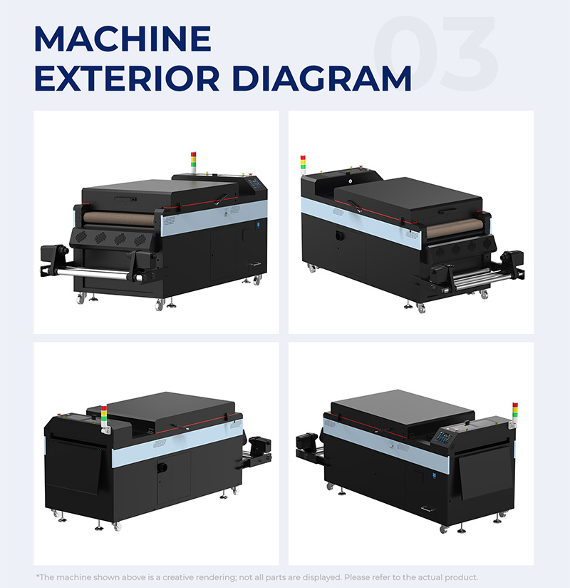 Our main products: DTF printer, UV DTF printer, DTF powder shaker and dryer.All in one DTF printer, sublimation heat system for directly printing machine, flag printing machine, smoke purifie , design and manufacture equipment according to customers' requirements etc.The company focuses on equipment research and development innovation, as well as technological optimization. Our goal is to become the industry's top tier equipment supplier with the highest quality.